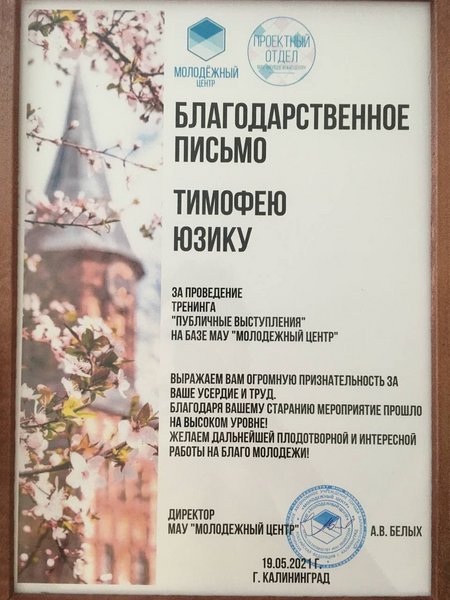 Имею более 4 лет опыта работы тренером публичных выступлений, психологии общения, лидерства и личной продуктивности как индивидуально, так и с группами (для детей и взрослых).