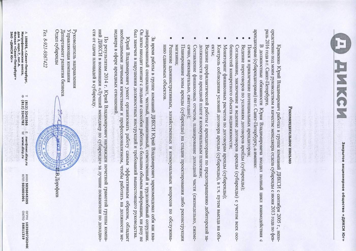 • Награжден почетной грамотой группы компаний ДИКСИ в номинации «Лучший менеджер по субаренде» за лучшие показатели по доходности от сдачи площадей в субаренду.