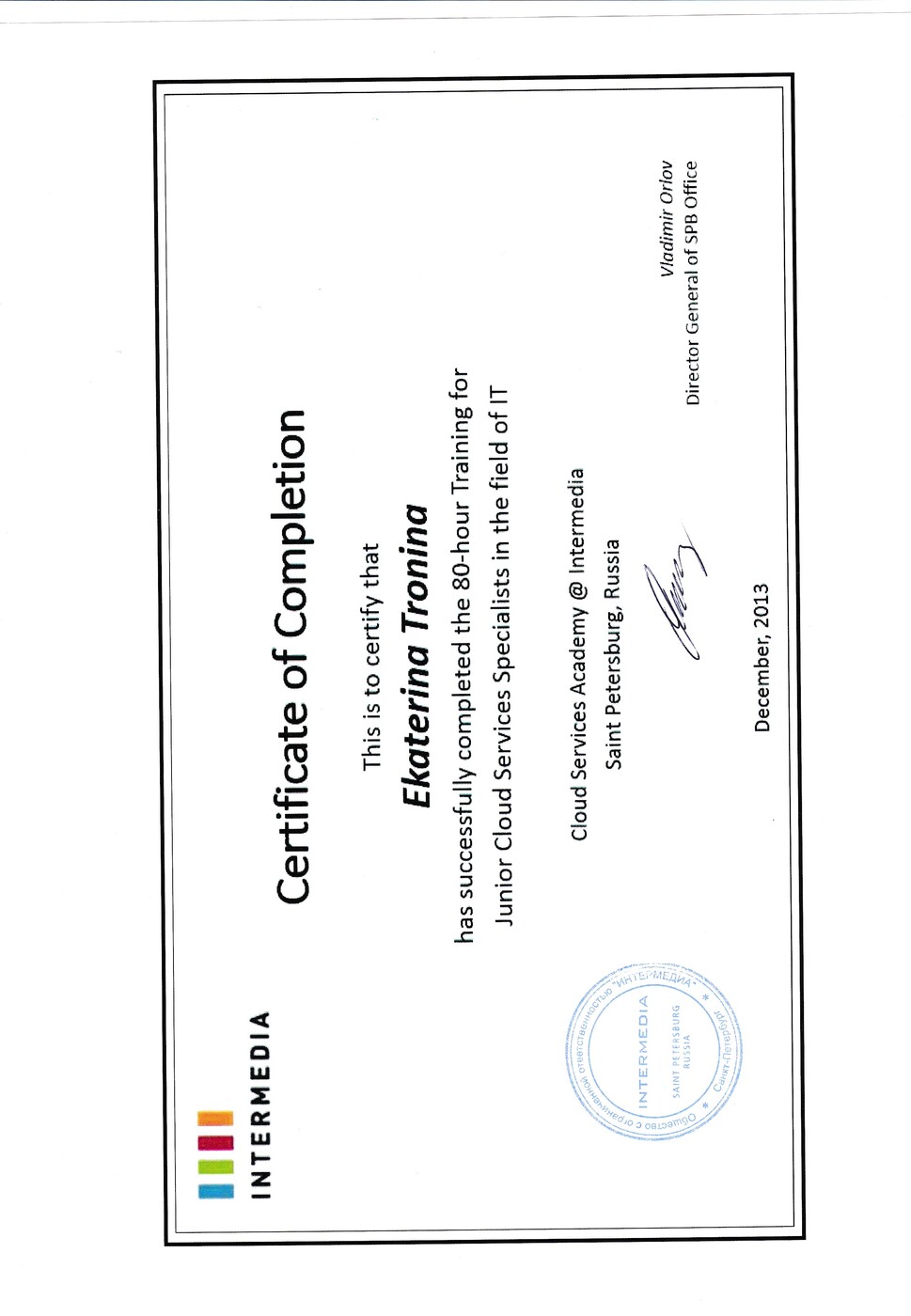 • Имеется сертификат о прохождении стажировки в ООО «Интермедиа» - Санкт-Петербургское подразделение Калифорнийской компании - разработчика облачных технологий.