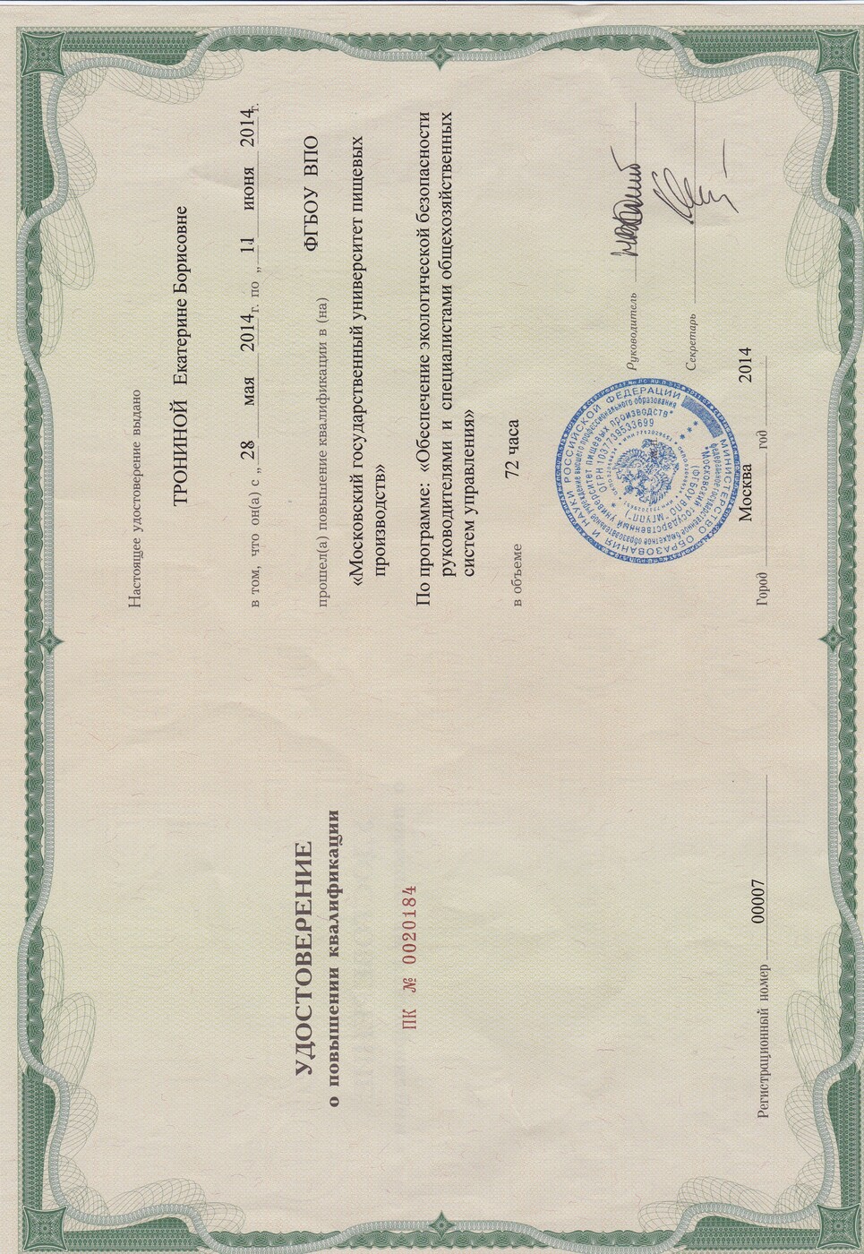 • Имеется удостоверение о повышении квалификации по программе «Обеспечение экологической безопасности руководителями и специалистами общехозяйственных систем управления»