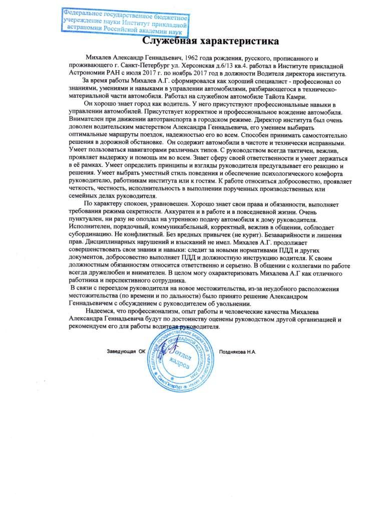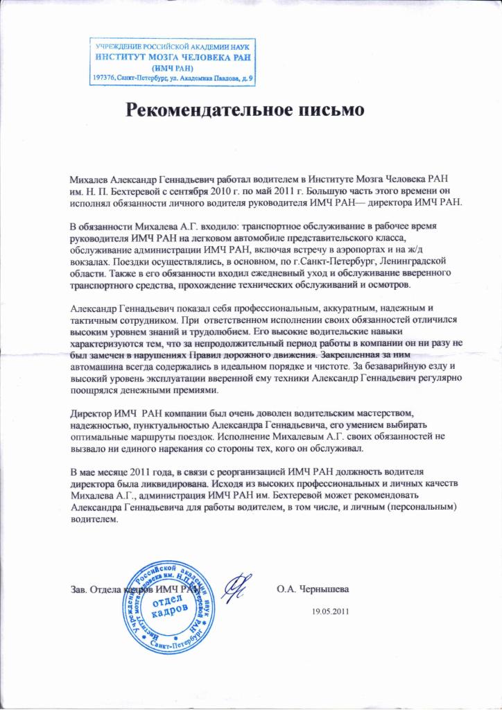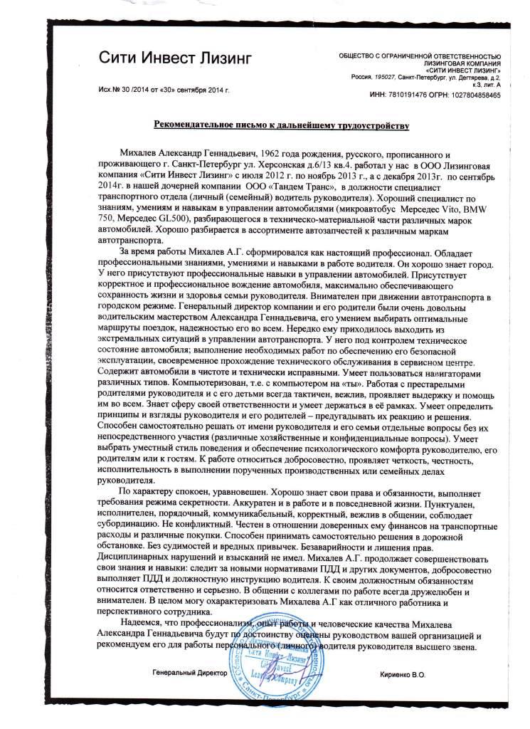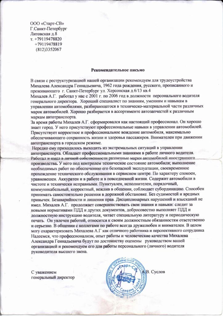 Внешне опрятен. При необходимости соблюдение дресс-кода для водителя. Без судимостей. Без в/п. Не курю. Безаварийность и лишение прав. Дисциплинарных нарушений и взысканий с прежних мест работы не имел. Имею в наличие загранпаспорт и действующую шенгенскую визу. Имею в наличии письменные рекомендации от предыдущих работодателей, а так же от административного звена Смольнинского ГУПА (обслуживания верхних эшелонов власти города Санкт-Петербурга)