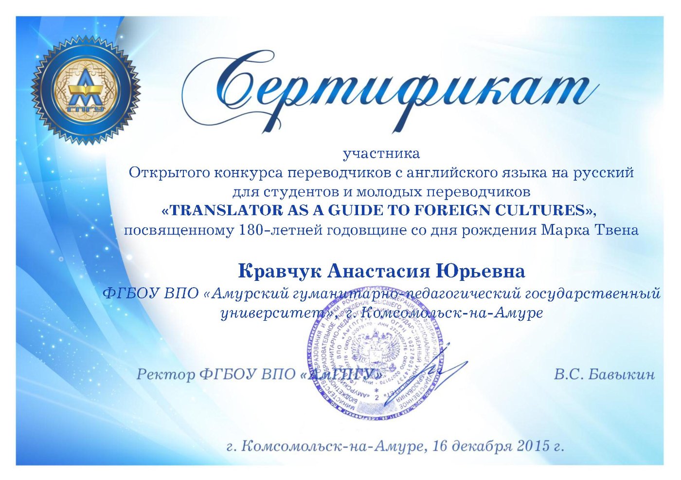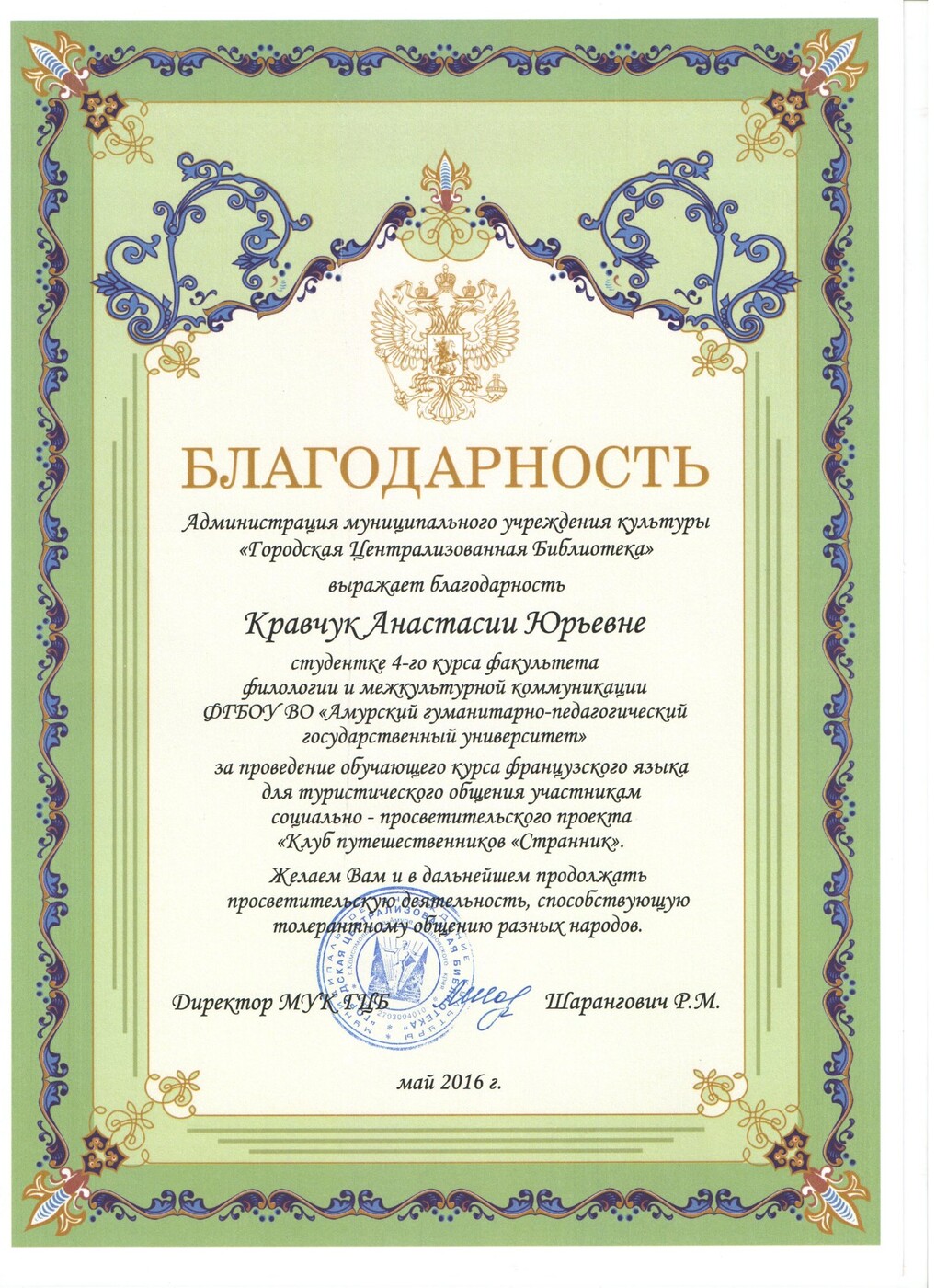 Проводила ознакомительный курс по французскому языку в рамках обучающе-просветительского проекта "Клуб путешественников "Странник". Курс длился в месяц, в результате чего, посетители клуба ознакомились с основами французского языка, его особенностями и базовыми туристическими фразами, а так же некоторой туристической информацией. По завершению курса некоторые участники проекта выявили желание продолжать изучать французский язык, в связи с чем им были даны рекомендации касательно учебных изданий и образовательных порталов сети Интернет.